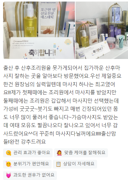 제가 첫째때에는 조리원에서 마사지를 받았지만 둘째때에는 조리원은 갑갑해서 마사지만 선택했는데 가성비 굿굿굿~