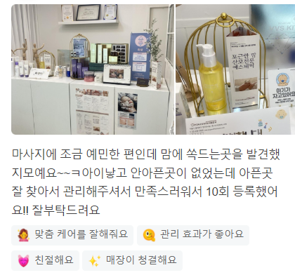 아이낳고 안아픈곳이 없었는데 아픈곳 잘 찾아서 관리해주셔서 만족스러워서 10회 등록했어요!!