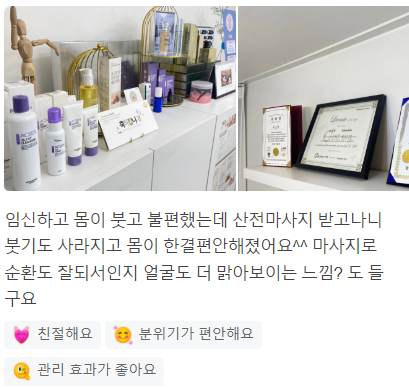 임신하고 몸이 붓고 불편했는데 산전마사지 받고나니 붓기도 사라지고 몸이 한결편안해졌어요^^